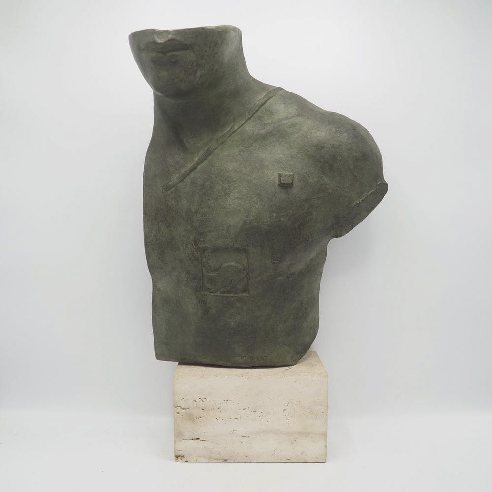 Technika: Brąz patynowany, podstawa z trawertynu (lub kamienia naturalnego).