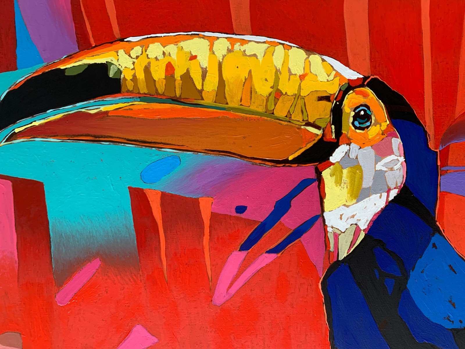Rafał Gadowski - absolwent krakowskiej Akademii Sztuk Pięknych, w swoim obrazie „Tukan 14” umiejętnie łączy motyw zwierzęcy z intensywną, żywą paletą barw, tak charakterystyczną dla jego twórczości. Obraz przedstawia tukana ujętego w syntetycznej, graficznej formie, gdzie kolor staje się głównym środkiem wyrazu. Diamentowy układ pól barwnych, niczym kamieni szlachetnych zamkniętych w biżuteryjnej oprawie, przywodzi na myśl estetykę cloisonizmu.